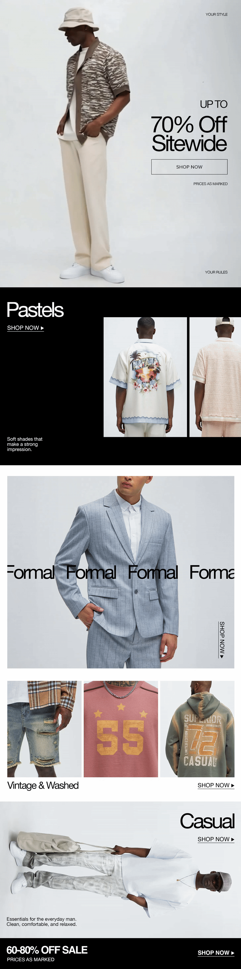 Working as a contracted Digital Design Lead for the Men’s Division at Fashion Nova, I generated digital design assets and collaborated cross-functionally with the marketing, e-commerce, and product teams to ensure cohesive, high-impact visuals across all platforms—from web to social media to email campaigns. I was responsible for setting and maintaining the visual identity for Fashion Nova Men, ensuring our digital presence aligned with brand goals and resonated with our trend-forward, culturally tuned-in audience. With a strong eye for contemporary design, user experience, and streetwear-inspired aesthetics, I drove innovation in campaign graphics, product launches, and online storytelling. I thrived in a fast-paced environment, translating data insights and market trends into visually compelling content that boosted engagement, drove conversions, and strengthened brand loyalty.